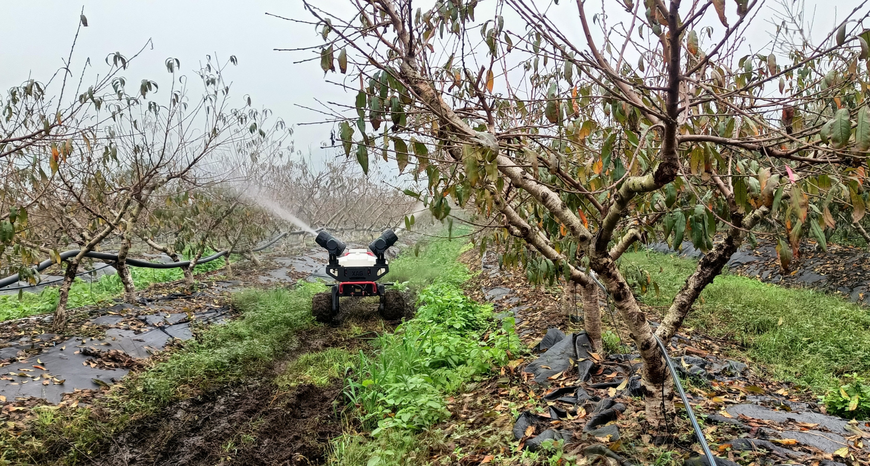 桃树果园现代农机进行喷药、除草操作。资料图