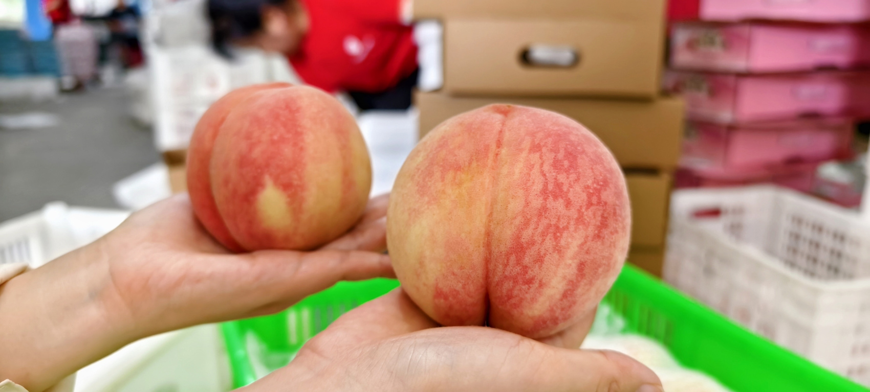 7月4日下午,家住重庆涪陵的杨曦收到从成都寄来的一箱龙泉驿水蜜桃精品果,打开包裹的一瞬间,浓郁的桃香味扑鼻而来,十来个白里透红的水蜜桃精致地摆在箱子里。“早就听说龙泉驿的小白凤好吃,特意买来尝鲜,一箱138元,一个桃超过10块钱,小贵。”杨曦说。