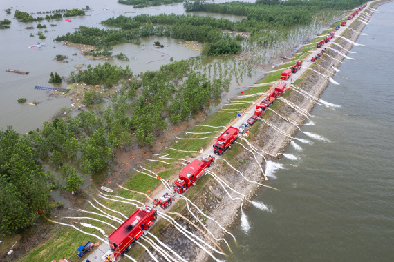 ▷9日,湖南岳阳华容县洞庭湖决口完成封堵后,开始第一批抽排积水,同时第三道防线正全线推进施工。应急管理部调派力量装备增援湖南华容开展排涝工作。