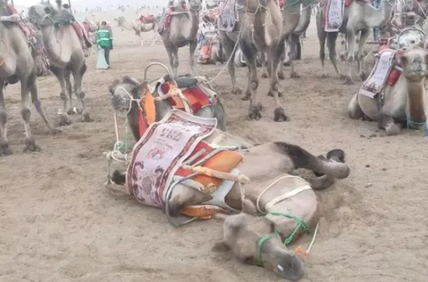 ▷敦煌鸣沙山景区回应骆驼累死传闻:实为累趴,未死,景区高峰期骆驼工作量大。
