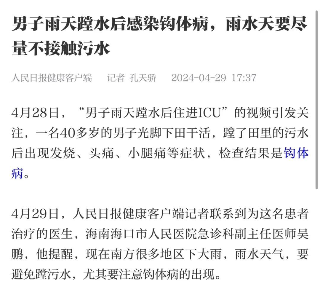 医生介绍,早在2023年7月,他曾接诊一名50多岁的男子,暴雨后路面积水,他脚上有伤口,蹚了污水后出现发热、小腿痛、头痛等症状。一开始以为是普通的发烧,吃药后未见好转,发烧40℃不退第三天到医院就医。