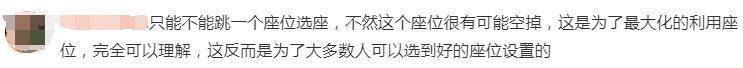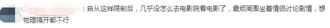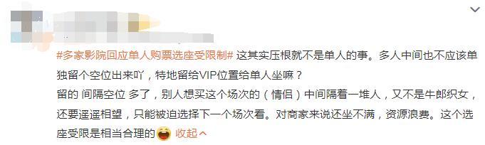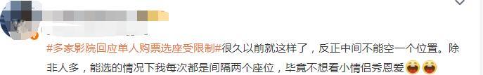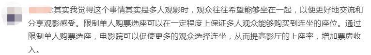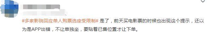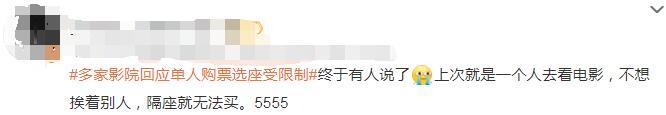 影院这些限制会导致单人观众无法选到心仪的位置。在新浪微博相关话题下,有很多网友吐槽自己有类似经历。有网友表示,看电影不想挨着别人,不想听到旁边的人讨论剧情,自从有这些限制后,就不怎么去电影院了↓↓↓