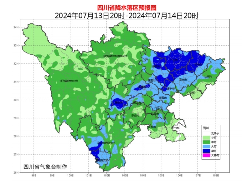 据四川省气象台预报,7月10日20时到11日20时,达州、广安、泸州3市和巴中、南充2市东部、凉山州中部有大雨到暴雨(雨量30-80毫米),达州局地有大暴雨(100-120毫米),最大小时雨量30-60毫米,另甘孜州南部有大雨(雨量25-40毫米)。