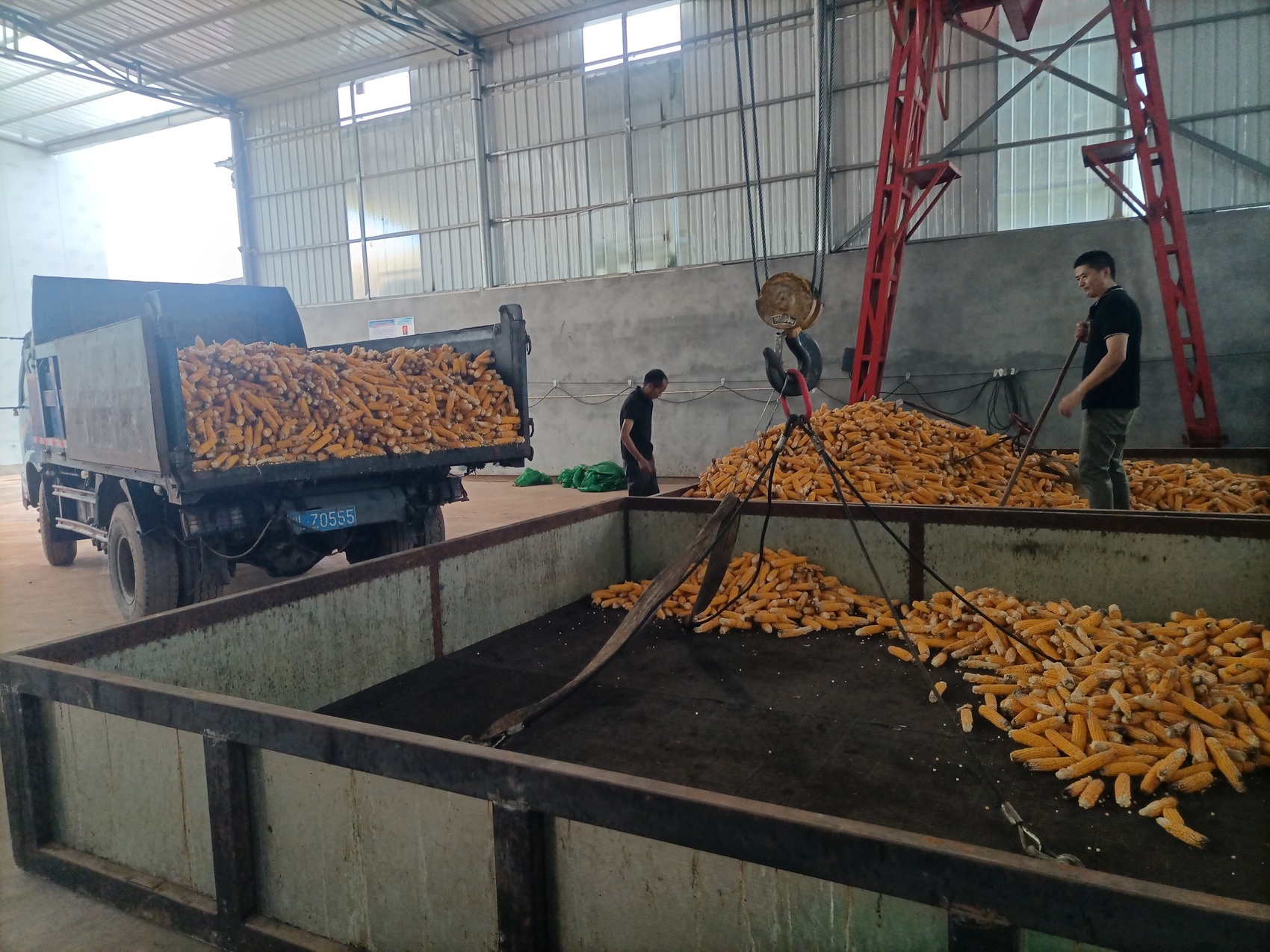 在阴雨天气下采收的玉米,也需要及时烘干。7月10日,井研县迎来大雨,周建伟没有安排采收玉米的工作。在井研县老农民水稻种植专业合作社的烘干房内,工人们正将采收回来的玉米棒送入烘干机。周建伟说,“这些是前两天雨小些的时候采收回来的,今天抓紧把它们烘干。”