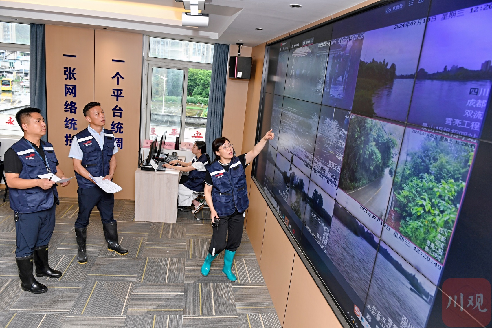 在永安镇城运中心,工作人员利用大屏巡查锦江沿线水位情况。