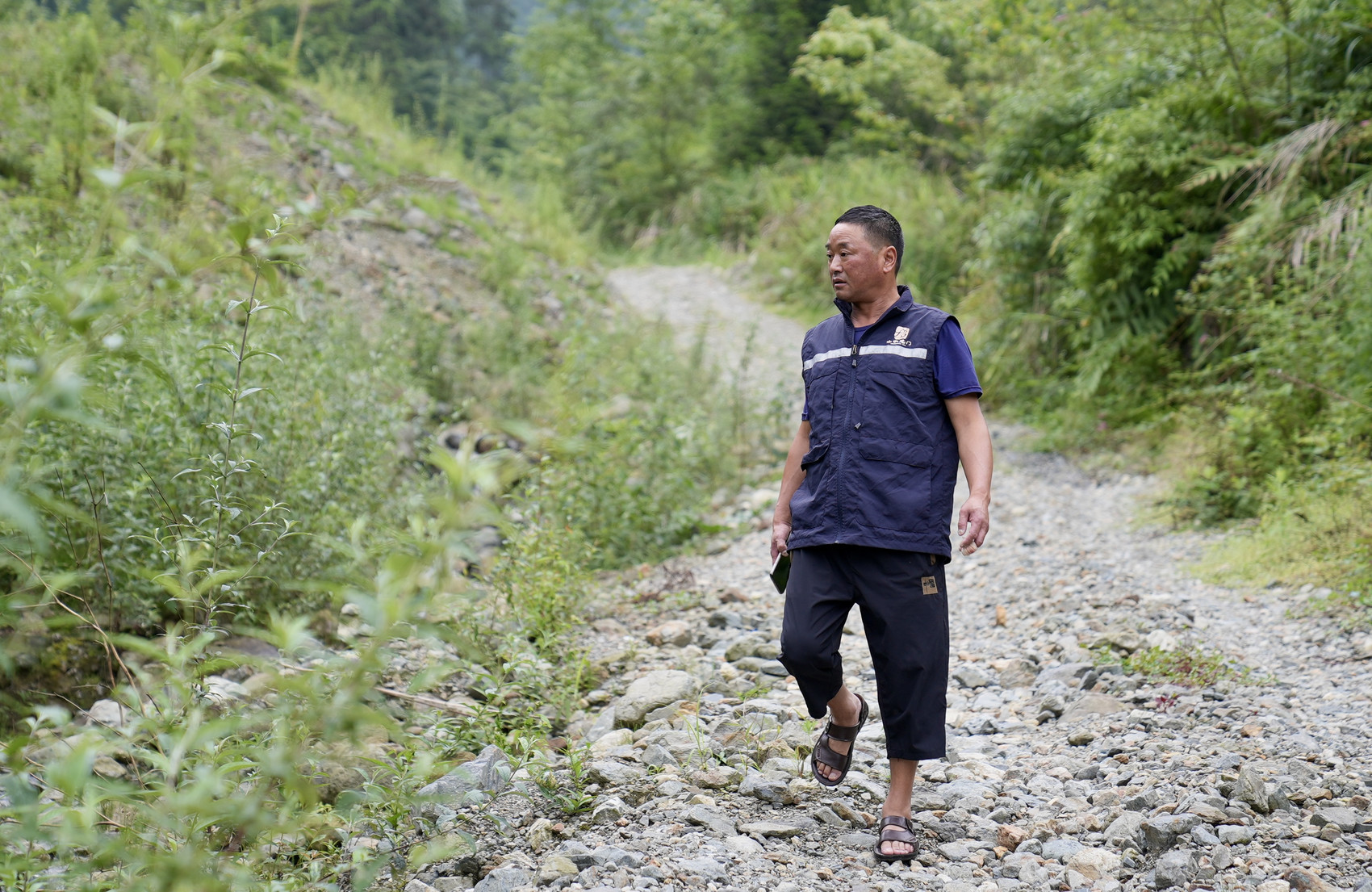 这里是位于龙门山镇九峰村的龚家湾弯道,是一处地质灾害隐患点。川观新闻记者跟随地灾监测人员谢启贵徒步上山,裸露山石一直铺到视线尽头,“这些都是往年发生泥石流时冲下来的塌方体,现在就是我的巡查路。”