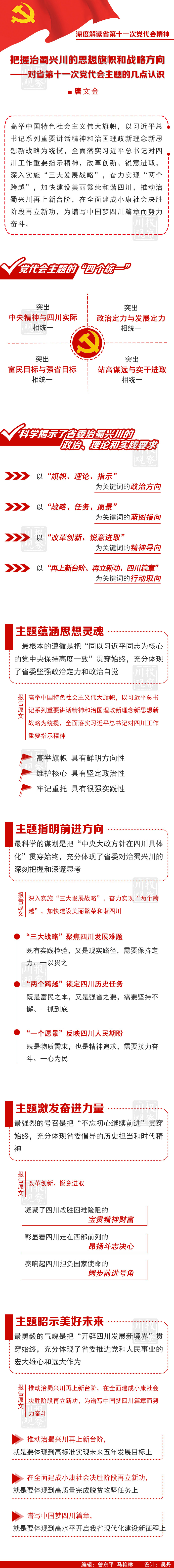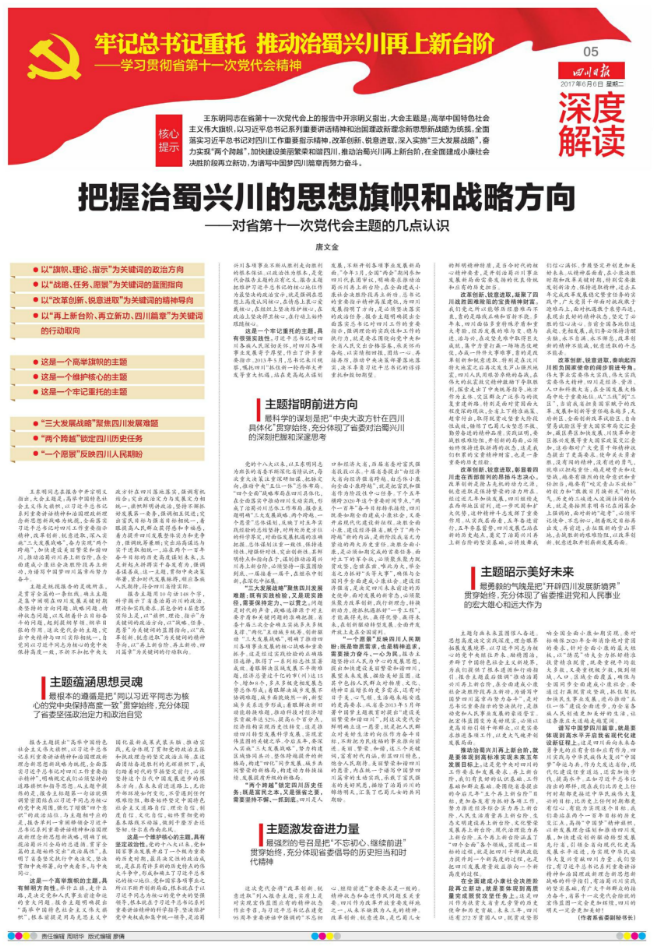 今天,6月6日,四川日报在第五版以整版篇幅,推出深度解读省第十一次党代会精神的系列署名文章的第二篇。作者是省委副秘书长唐文金,文章主题是《把握治蜀兴川的思想旗帜和战略方向》。