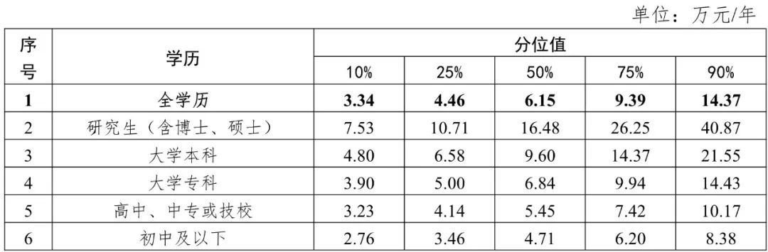 从学历工资价位来看,学历越高,从业人员的工资报酬水平越高。研究生(含博士、硕士),大学本科,大学专科劳动者的工资报酬中位数分别是16.48万元/年、9.60万元/年、6.84万元/年。