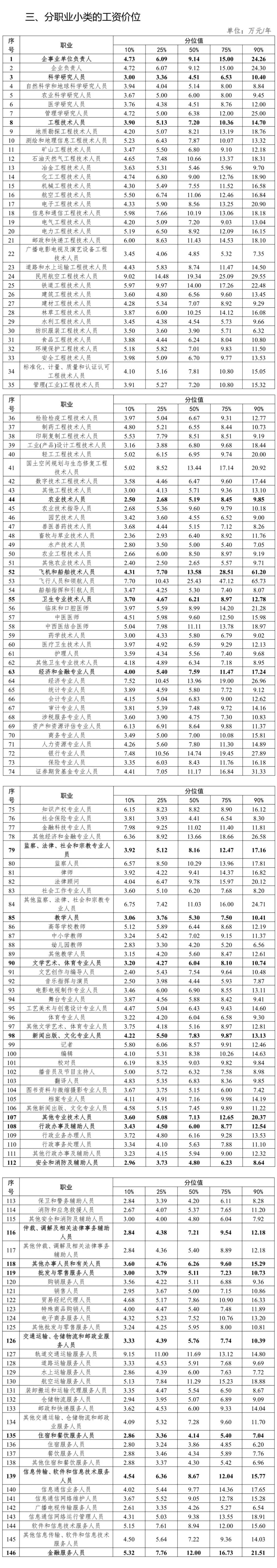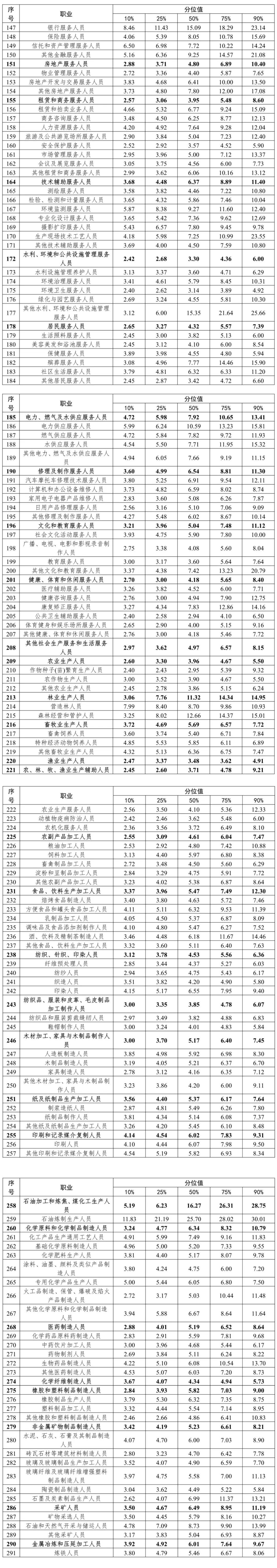 从职业小类工资价位来看,中位数排名前五的职业是石油加工和炼焦、煤化工生产人员,飞机和船舶技术人员,金融服务人员,林业生产人员,企事业单位负责人,分别为16.27万元/年、13.58万元/年、12.00万元/年、11.32万元/年、9.14万元/年。
