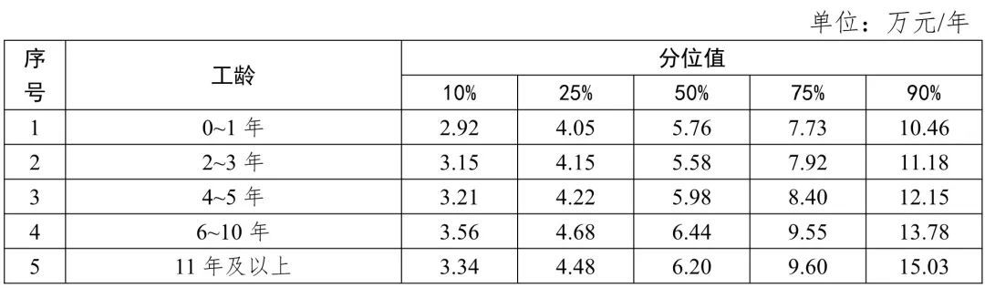从工龄工资价位来看,6-10年工龄劳动者工资报酬水平中位数最高,为6.44万元/年;0-1年工龄劳动者工资报酬水平中位数最低,为5.76万元/年。