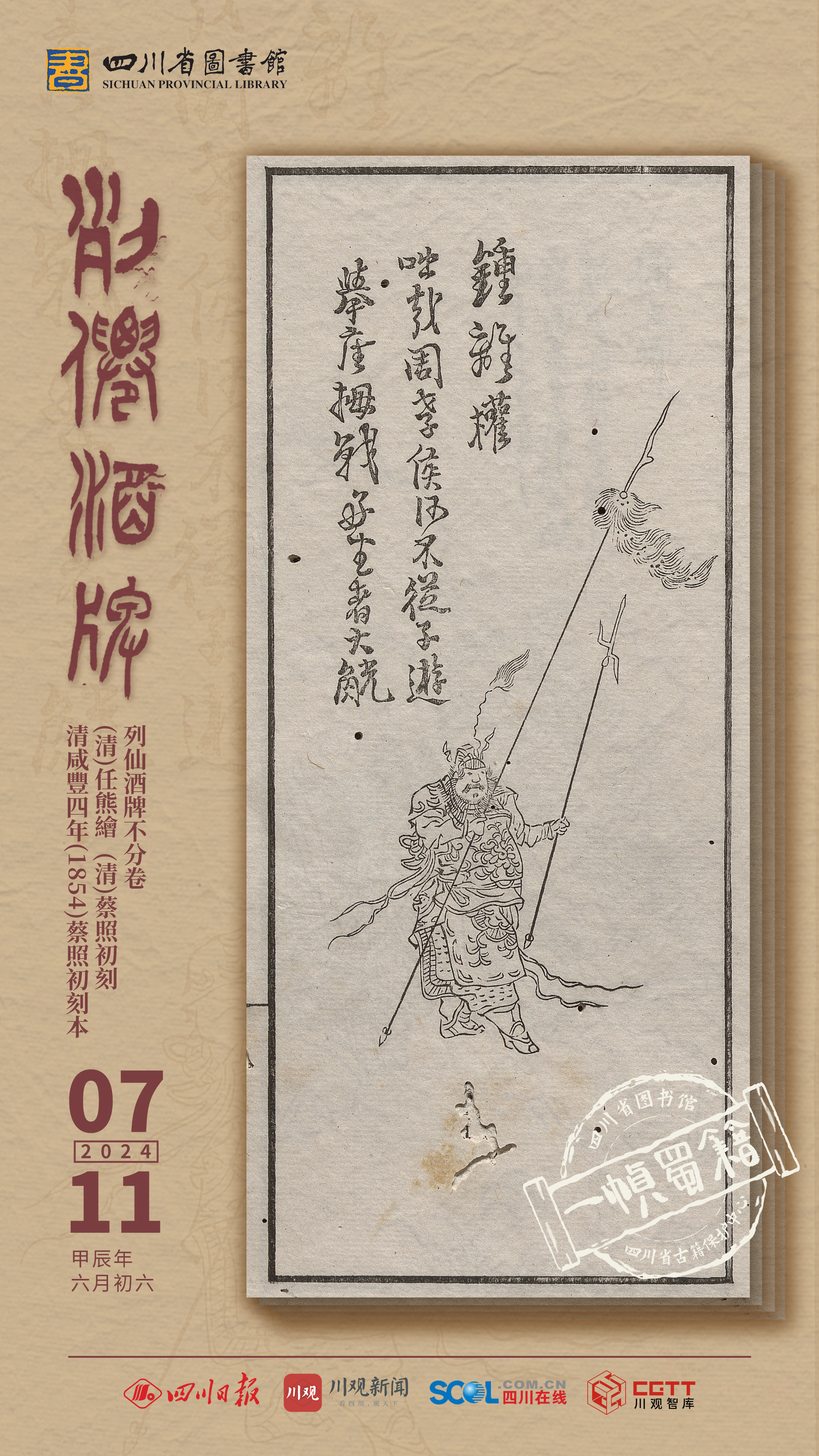 7月11日,一帧蜀籍邀请大家来抽酒牌,抽到这张酒牌时,席间最豪爽大气的人应该饮酒一杯。海报图所选版本为《列仙酒牌》不分卷 (清)任熊绘 (清)蔡照初刻 清咸丰四年(1854)蔡照初刻本。