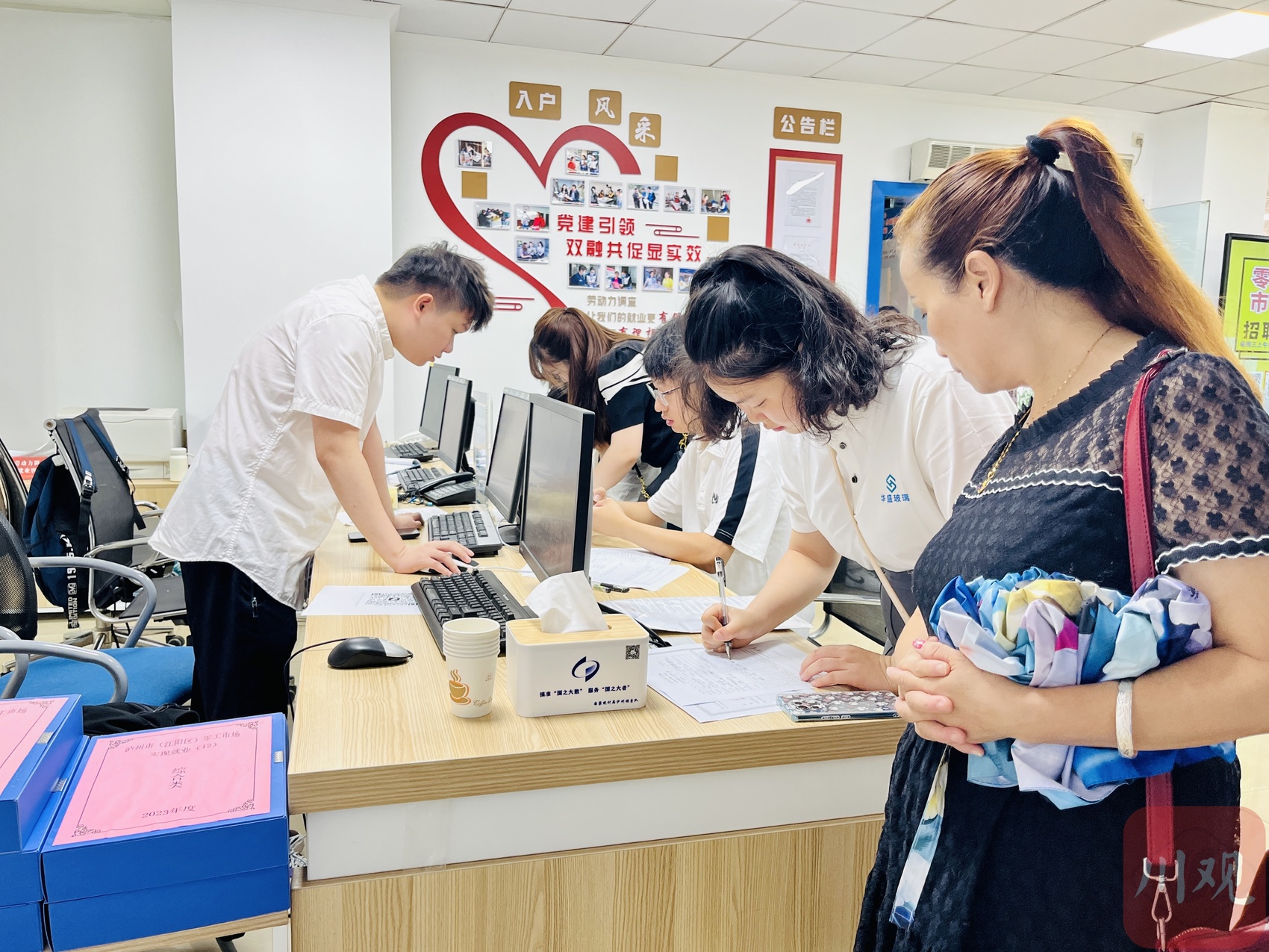 工作人员为企业和求职者提供服务。