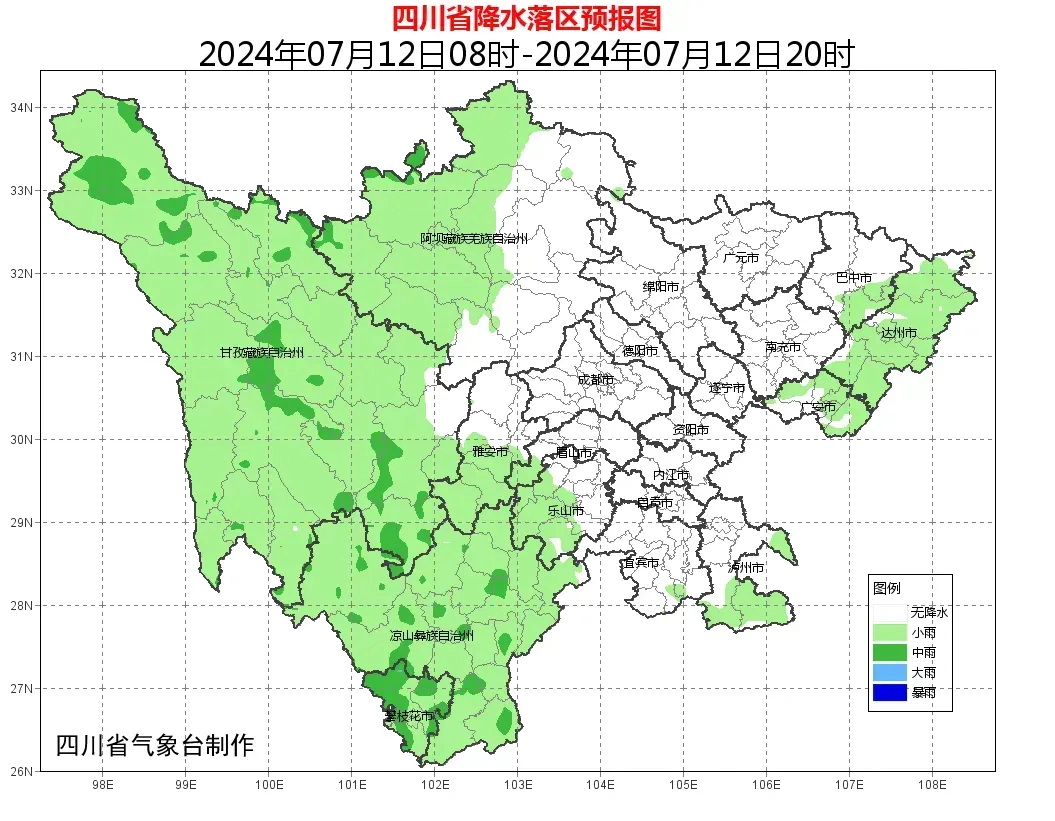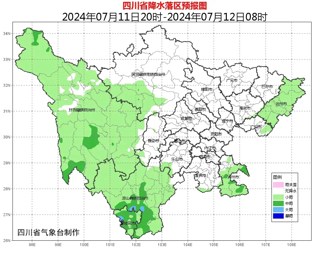 根据@四川气象 消息今日20时至明日20时,盆地大部阴天间多云,其中巴中、达州、广安、泸州、乐山、雅安6市有分散阵雨或雷雨,局部中雨;川西高原大部和攀西地区阴天间多云有雷雨或阵雨,雨量普遍小到中雨,攀西地区局部有大雨到暴雨。
