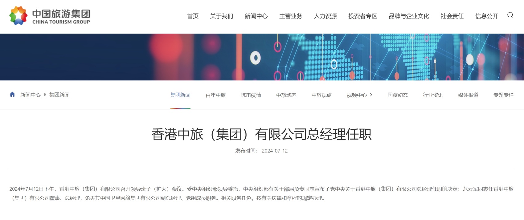 2024年7月12日下午,香港中旅(集团)有限公司召开领导班子(扩大)会议。受中央组织部领导委托,中央组织部有关干部局负责同志宣布了党中央关于香港中旅(集团)有限公司总经理任职的决定:范云军同志任香港中旅(集团)有限公司董事、总经理,免去其中国卫星网络集团有限公司副总经理、党组成员职务。相关职务任免,按有关法律和章程的规定办理。