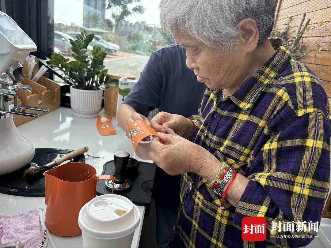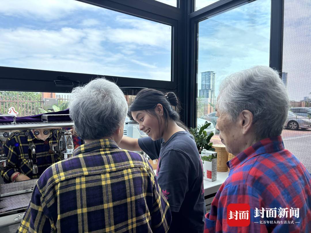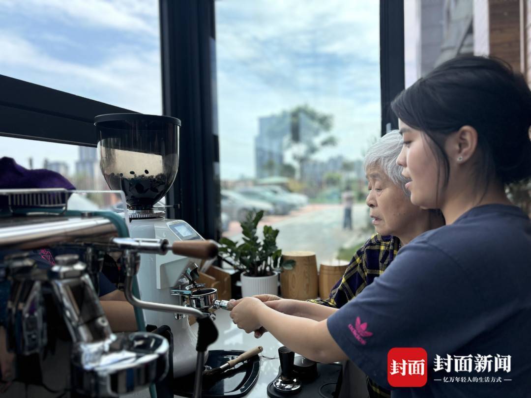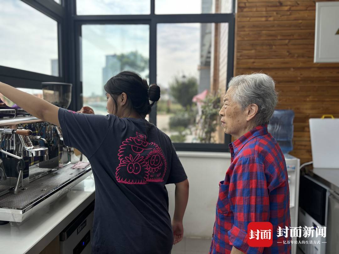 △吴亚男制作咖啡时,88岁的周奶奶在一旁观看