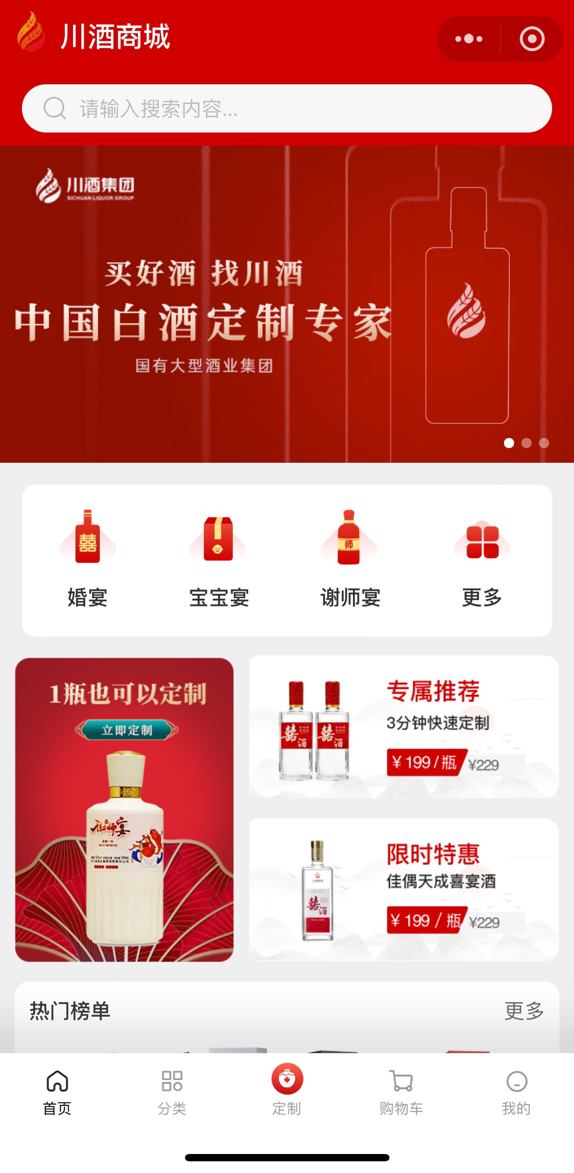 记者搜索发现,目前“川酒定制”小程序已上线并可正常使用,点开小程序首页就有定制酒界面,目前只有针对谢师宴和婚礼喜酒的两类定制酒。