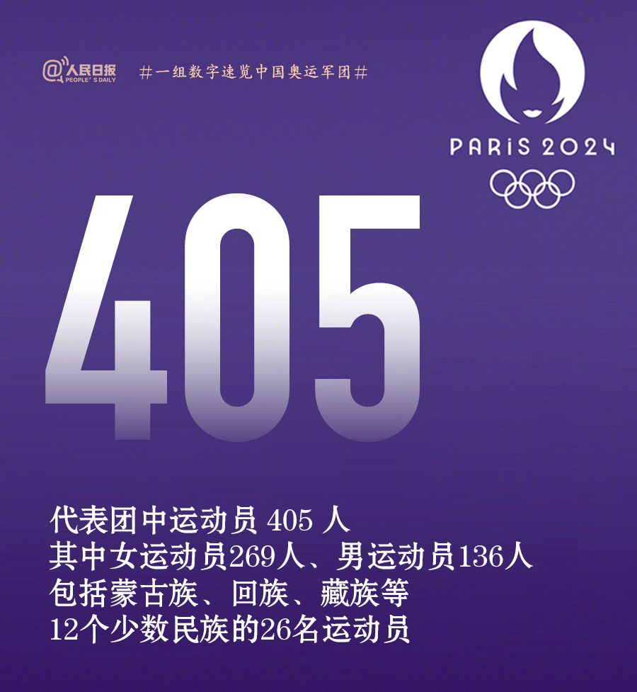 ②405:405位中国运动员出征巴黎奥运,包括男运动员136人、女运动员269人
