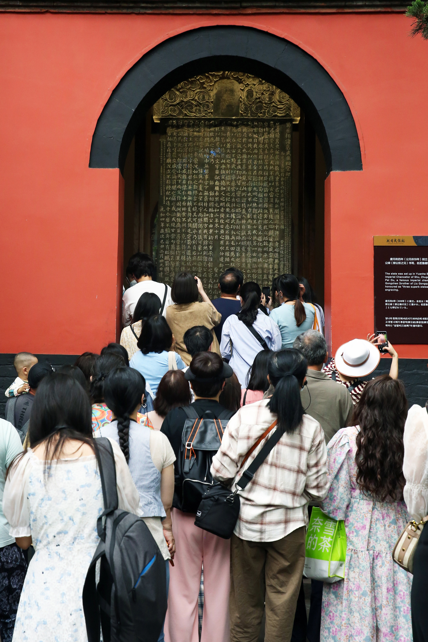 在文物资源的保护上,武侯祠博物馆近年来同样亮点频出。沿着中轴线向北到达诸葛亮殿。2022年,这里的墙体中发现15块(方)碑石,进一步丰富、印证了武侯祠的人文历史。2023年,成都首个文化遗迹、古树名木“司法保护工作站”落户武侯祠博物馆,推动司法保护服务与专业部门管护的融合。
