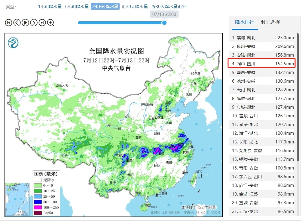 记者从阆中市气象台了解到,今天白天,阆中市曾出现大雨到暴雨,个别地方出现大暴雨,并于13时33分发布暴雨红色预警信号。据中央气象台数据显示,今天中午14时,阆中以70.5mm的降雨量排在全国首位。截至记者发稿时,阆中市24小时降水量已达154.5mm,位居全国第四。