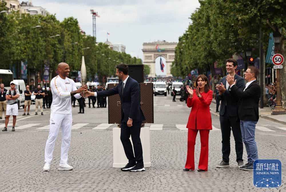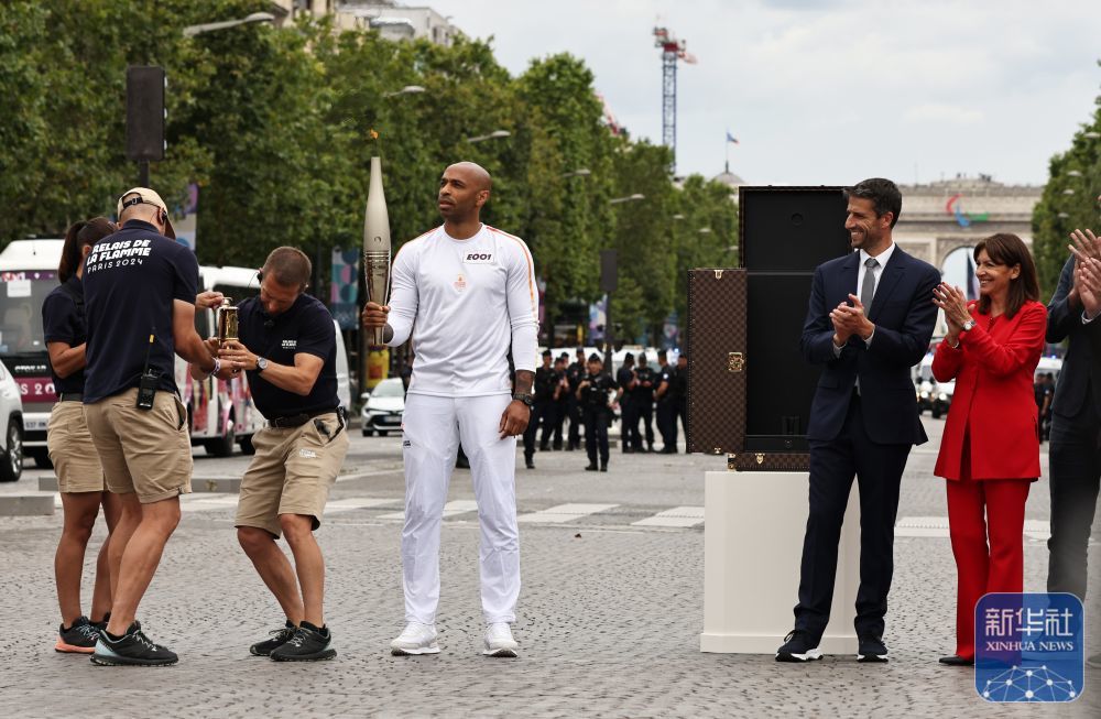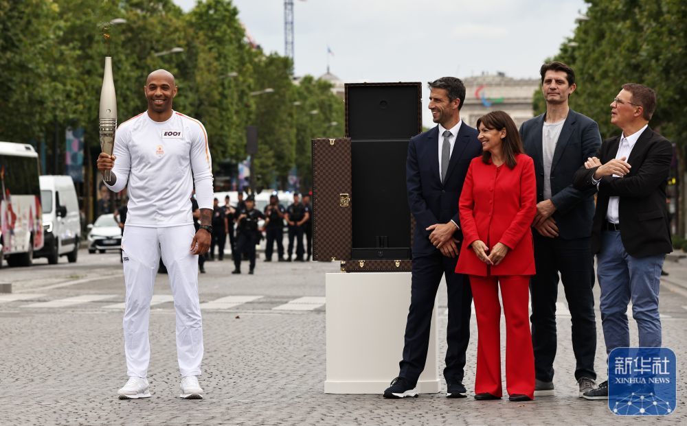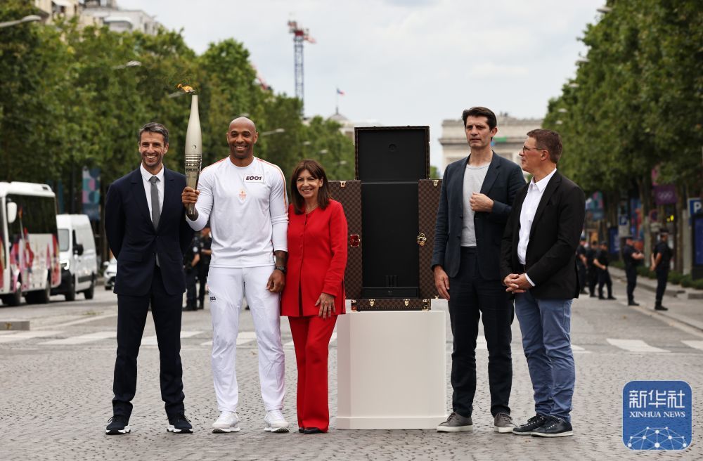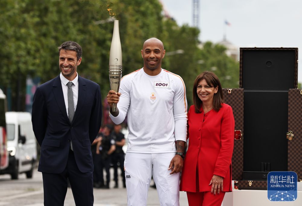 ↑亨利(中)与巴黎奥组委主席托尼·埃斯坦盖(左)、巴黎市长伊达尔戈在火炬传递现场合影。新华社记者 高静 摄