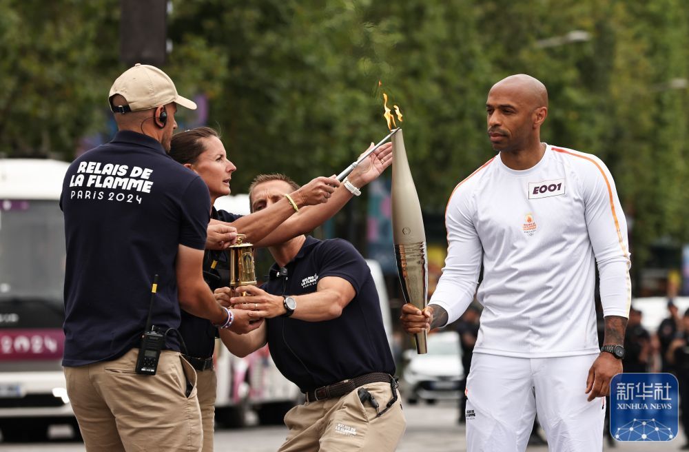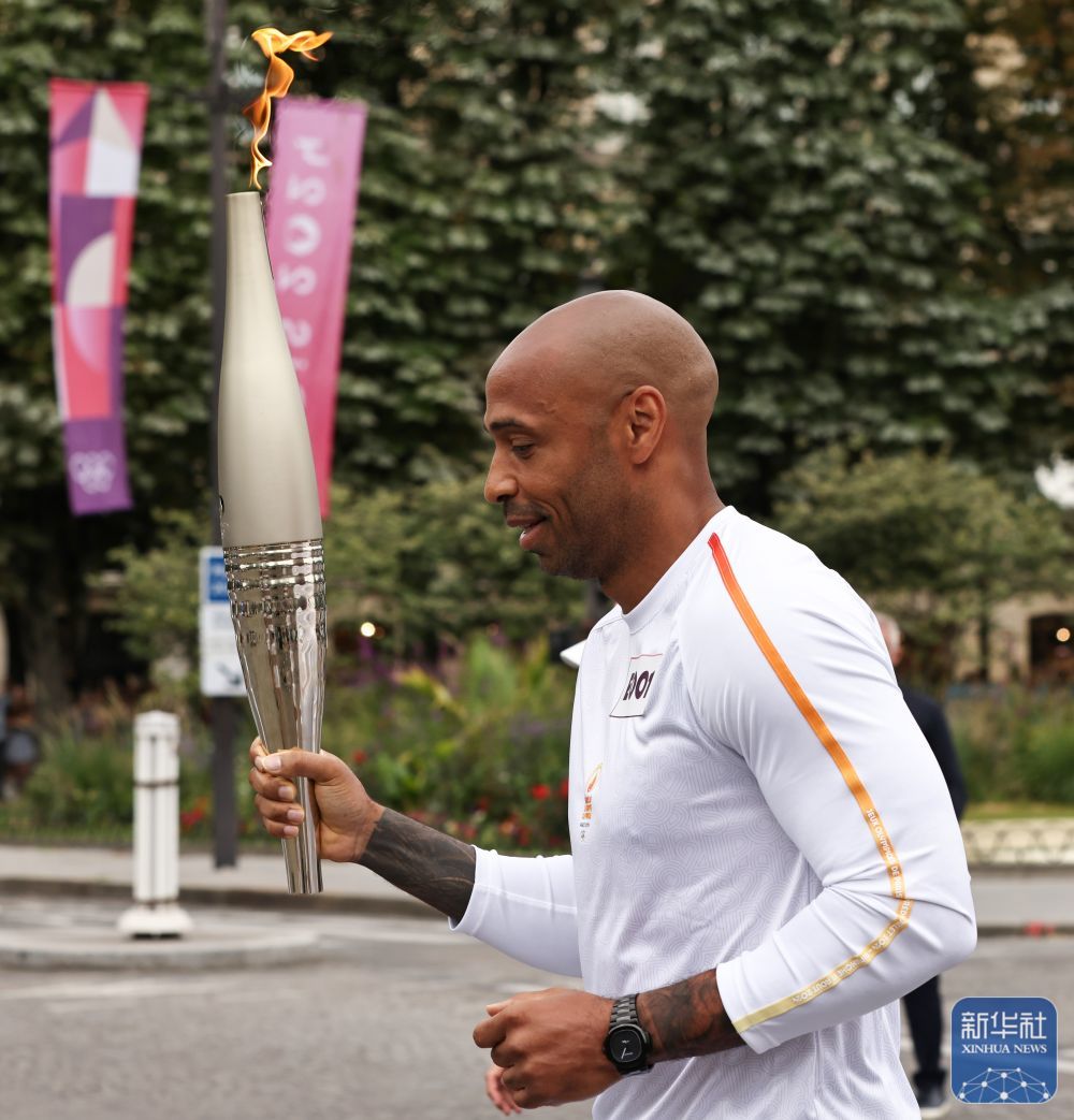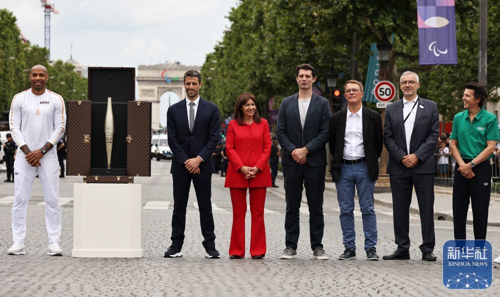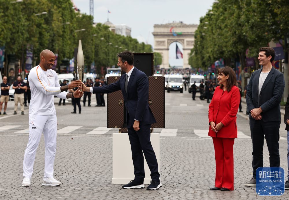 ↑亨利(中)与巴黎奥组委主席托尼·埃斯坦盖(左)、巴黎市长伊达尔戈在火炬传递现场合影。新华社记者 高静 摄