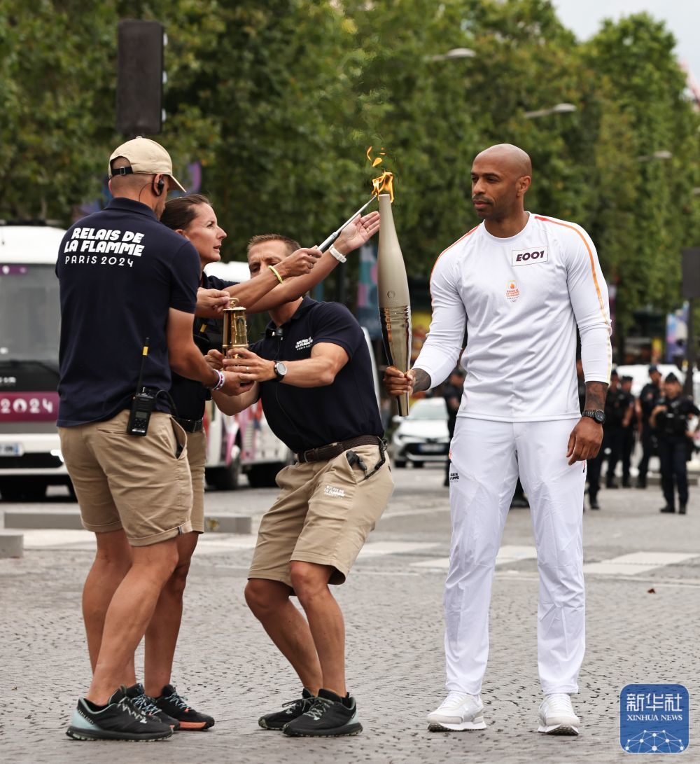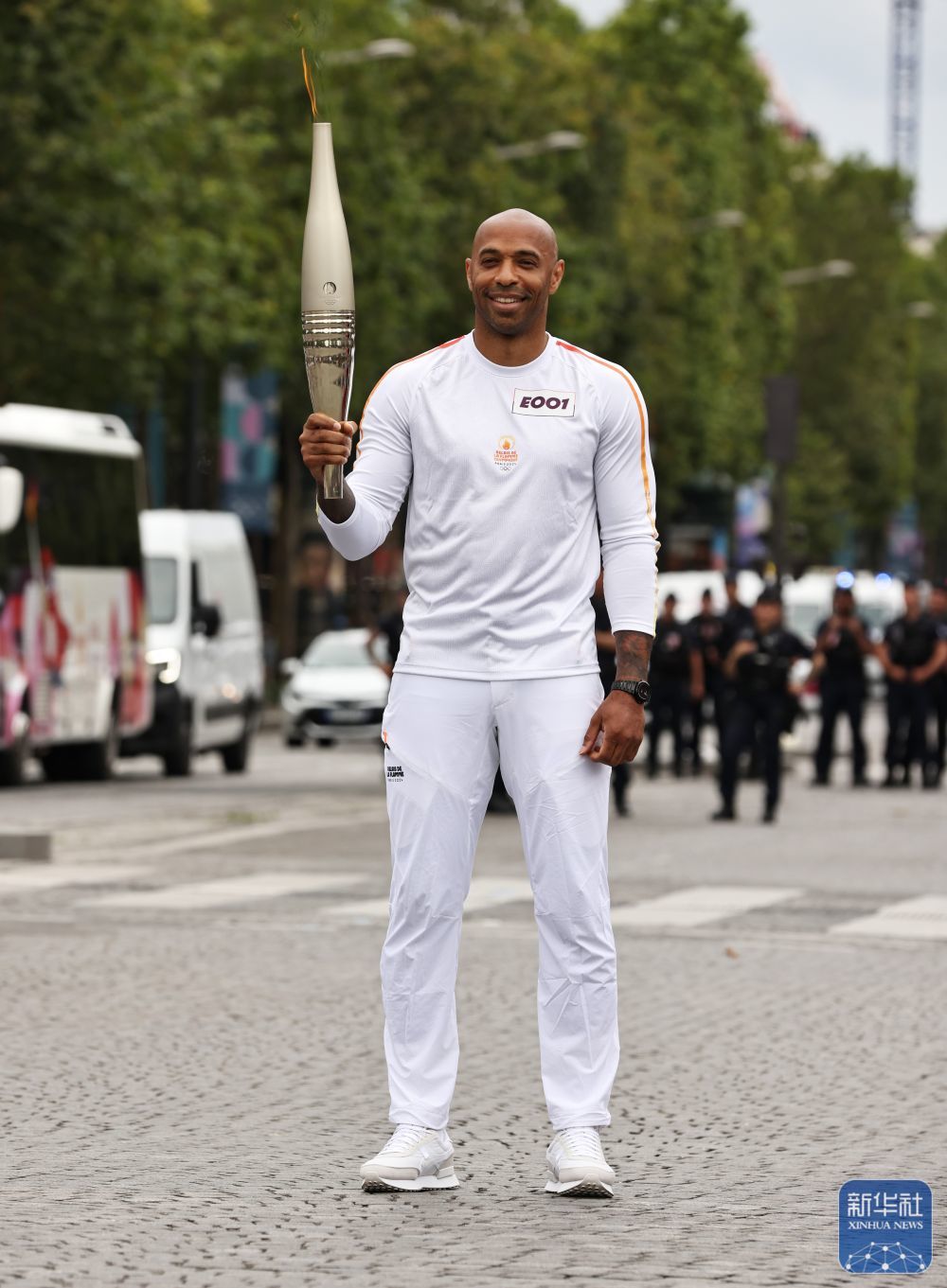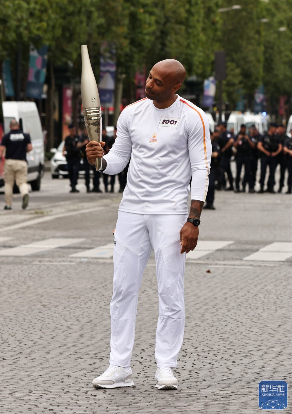 ↑在法国巴黎香榭丽舍大街,第一棒火炬手、法国国奥队主教练、法国前足球运动员亨利(前)手持火炬传递。