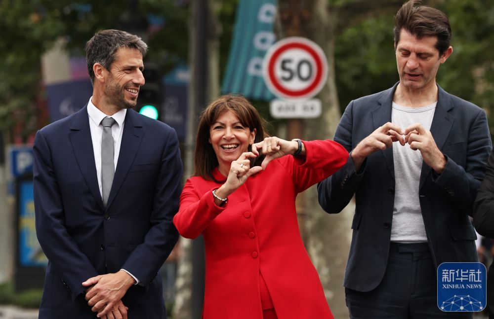 ↑巴黎奥组委主席埃斯坦盖(左)和巴黎市长伊达尔戈(中)在火炬传递现场合影。新华社记者 高静 摄
