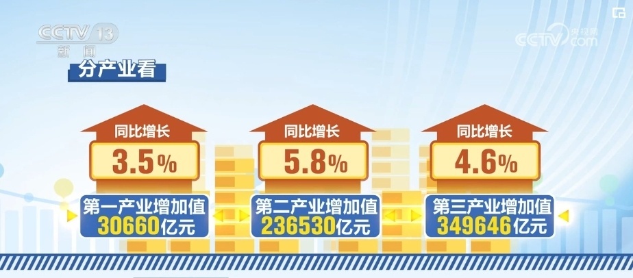 分产业看,第一产业增加值30660亿元,同比增长3.5%;第二产业增加值236530亿元,增长5.8%;第三产业增加值349646亿元,增长4.6%。分季度看,一季度国内生产总值同比增长5.3%,二季度增长4.7%。从环比看,二季度国内生产总值增长0.7%。