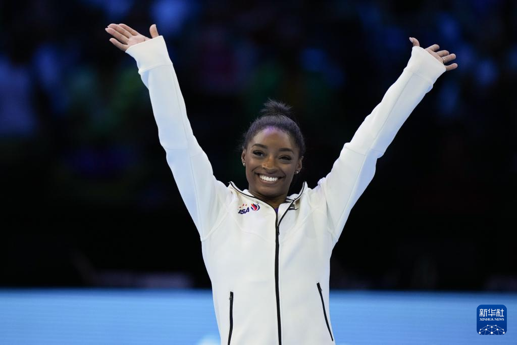 这是2023年10月8日,美国选手西蒙·拜尔斯在2023年体操世锦赛平衡木颁奖仪式上。新华社记者 郑焕松 摄