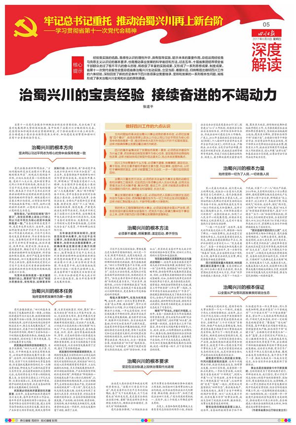 今天,6月8日,四川日报在第五版以整版篇幅,推出深度解读省第十一次党代会精神的系列署名文章的第四篇。作者是省委办公厅综合室主任张道平,文章主题是《治蜀兴川的宝贵经验 接续奋斗的不竭动力》。文章富于理性色彩,提纲契领,“六个根本”的总结令人印象深刻。