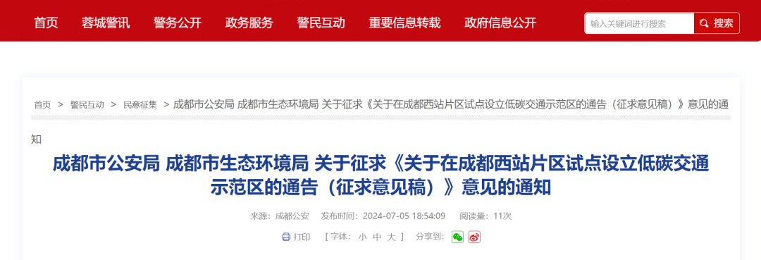 近日,记者从成都市公安局官网获悉,为改善城市环境空气质量,减少机动车排放污染,保障人民群众的身体健康,按照《成都市优化交通运输结构促进城市绿色低碳发展行动方案》等的工作要求,决定在我市试点实施低碳交通示范区。对此,市公安局会同市生态环境局共同研究,拟定了《关于在成都西站片区试点设立低碳交通示范区的通告(征求意见稿)》,现面向全社会广泛征集意见,相关意见请于2024年8月5日前反馈。