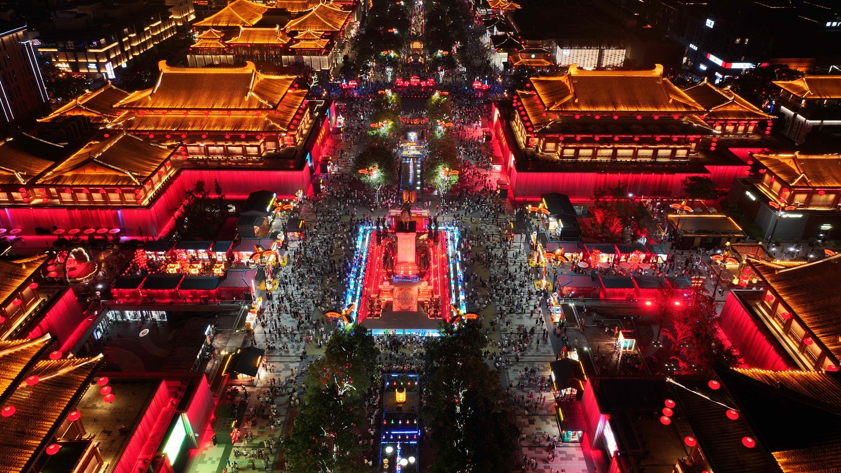 暑期的大唐不夜城热闹非凡,身着汉服的游客穿梭在盛唐特色的场景中,享受着与家人、友人相伴的欢乐时光。地屏广场上搭建的舞台格外引人注目,广元市利州区和西安市曲江新区的文旅推介宣传片在此滚动播出,仿佛是“现代”与“古代”的时空对话,引得各地游客纷纷驻足。