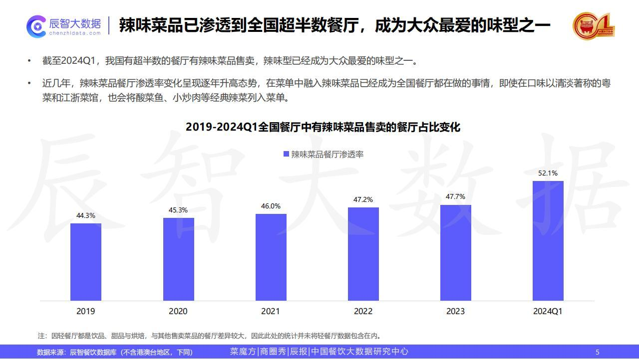 《报告》显示,截至2024第一季度,52.1%的餐厅有辣味菜品售卖。近年来,辣味菜品餐厅渗透率变化呈现逐年升高态势,不少口味以清淡著称的粤菜和江浙菜馆,也会将酸菜鱼、小炒肉等经典辣味菜品列入菜单。