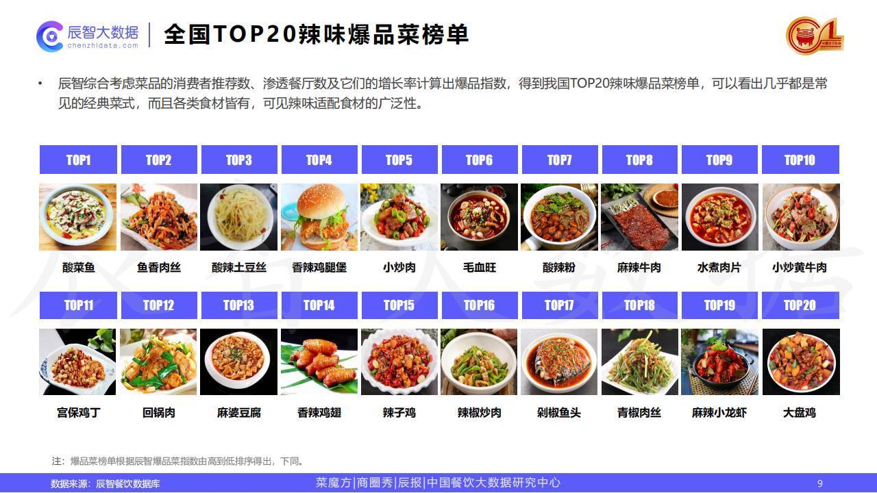 综合考虑菜品的消费者推荐数、渗透餐厅数及它们的增长率计算出爆品指数,得到辣味爆品菜TOP20榜单,酸菜鱼、鱼香肉丝、酸辣土豆丝等常见的经典菜式登上榜单前列。