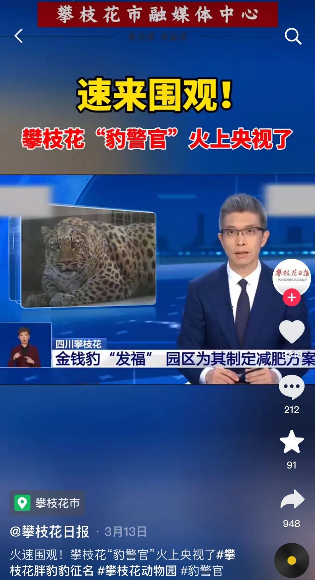 今年3月,攀枝花公园动物园区内,一只金钱豹因“胖”走红,网友调侃:2元的门票豹豹吃了1块8。攀枝花市协同中央、省级主流媒体及自媒体开展“攀豹豹”话题输出,全网曝光量“8亿+”,选题生产能力明显增强,四川故事更精彩动人。