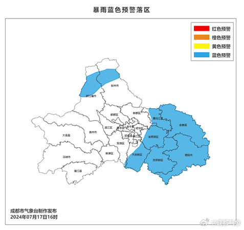 成都市气象台2024年07月17日16时00分继续发布暴雨蓝色预警:预计今天傍晚到明天白天成都市大部分地方强降雨持续,其中彭州、都江堰的局部地方有暴雨,天府新区、龙泉驿、青白江、金堂、简阳和东部新区的部分地方有暴雨(雨量50~80毫米),个别地方大暴雨(雨量100~150 毫米),最大小时雨量 40~60 毫米。过程期间,可能伴有短时强降雨、雷电和阵性大风等强对流天气。请注意防范暴雨、雷电和阵性大风带来的不利影响。