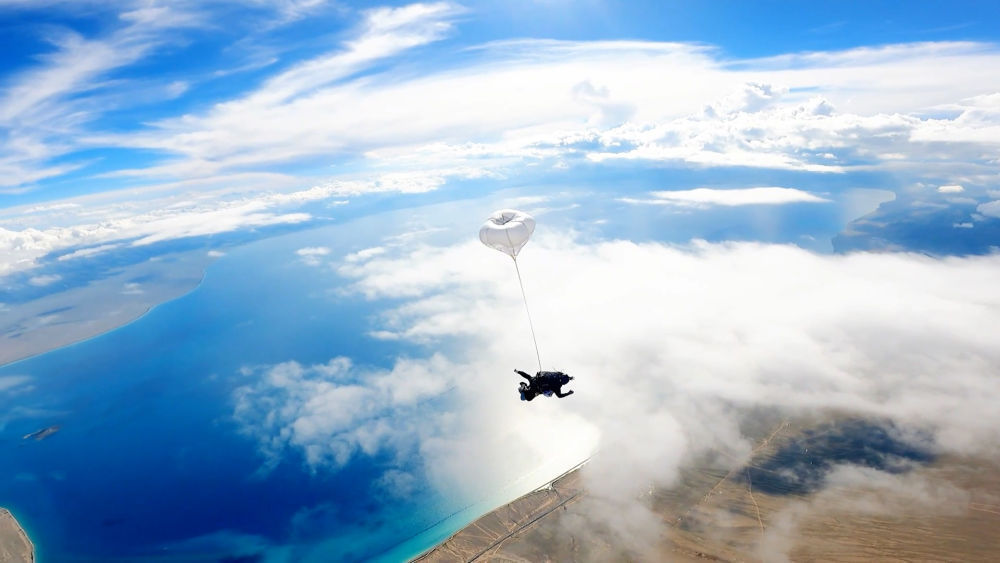 跳伞被称为“勇敢者的运动”。眼下,在新疆赛里木湖,游客可以体验到高空跳伞的刺激。