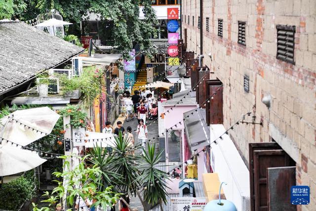 7月15日,游客在重庆市江北区五里店街道莺花巷合作村青年国际社区游览、拍照。