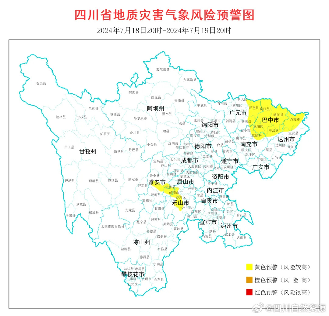 根据四川省气象台天气预报情况,结合四川省地质环境条件,7月18日20时至7月19日20时,全省地质灾害气象风险预警结果如下: