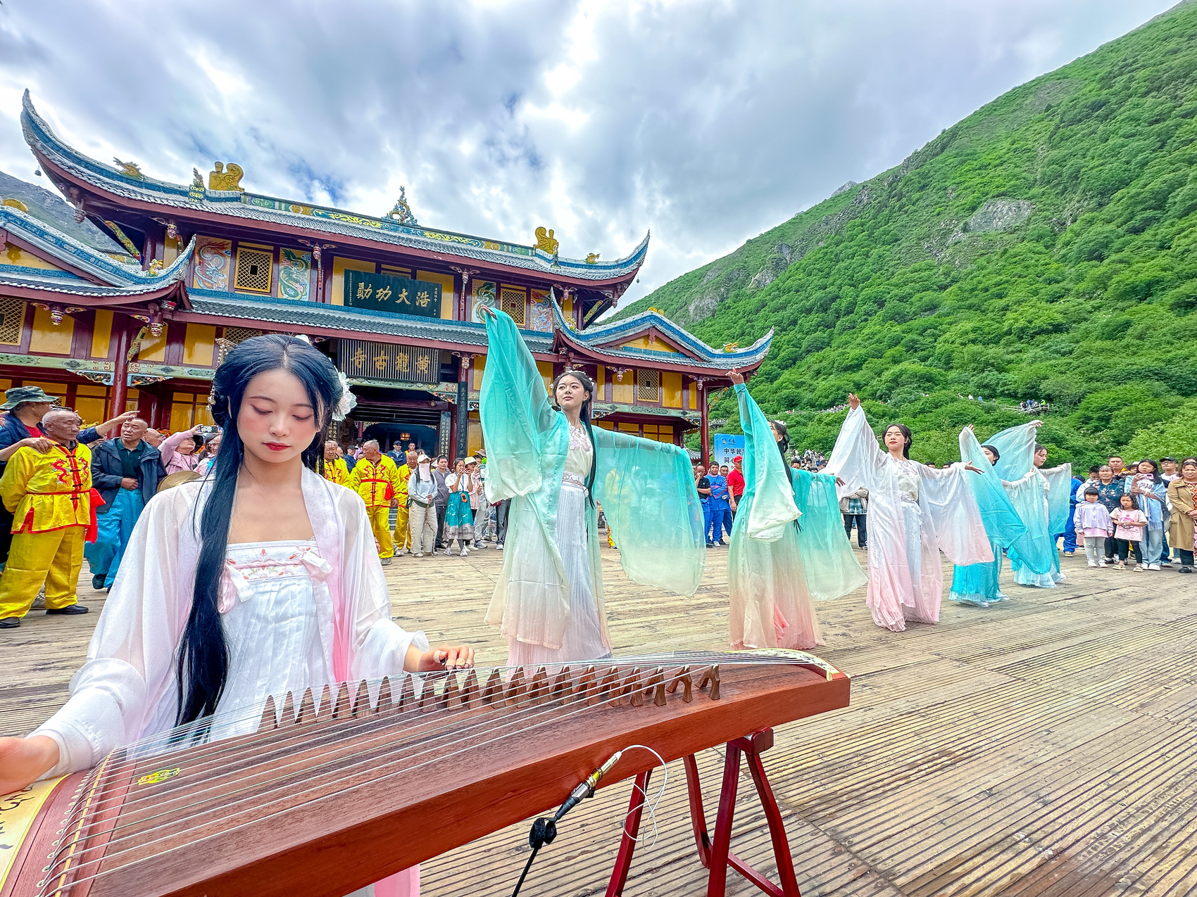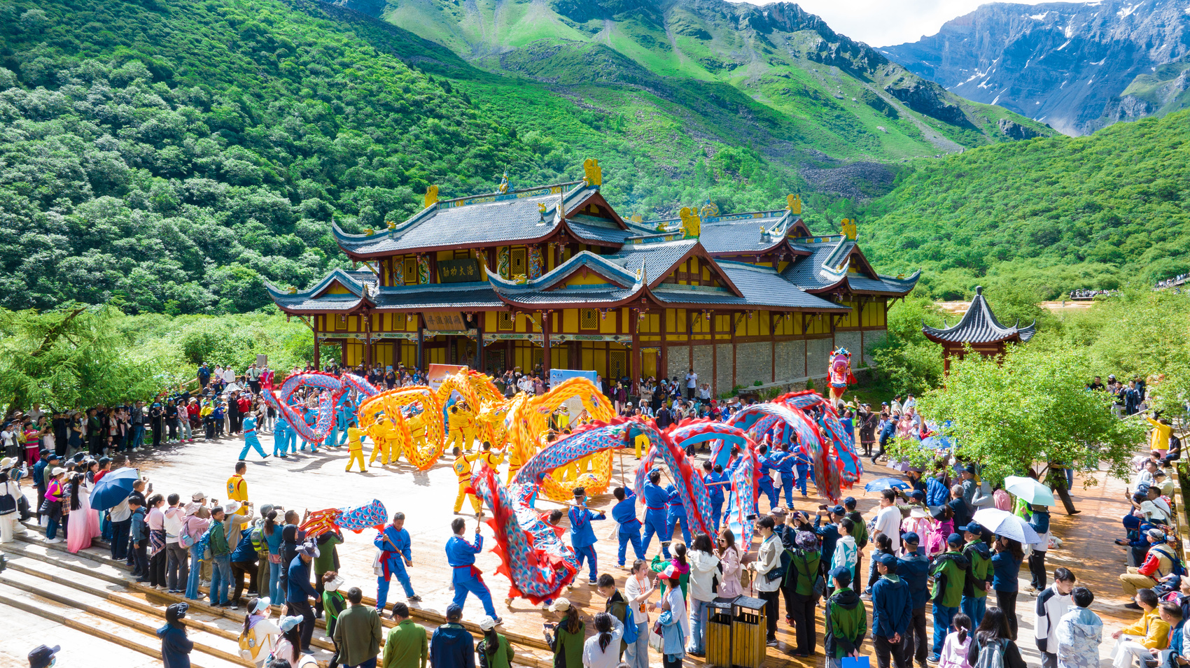 庙会现场,彩池斑斓、林海浩瀚,舞龙表演、古筝演奏、藏族山歌等接连上演,吸引了大批当地群众和游客参与,场面十分热闹。