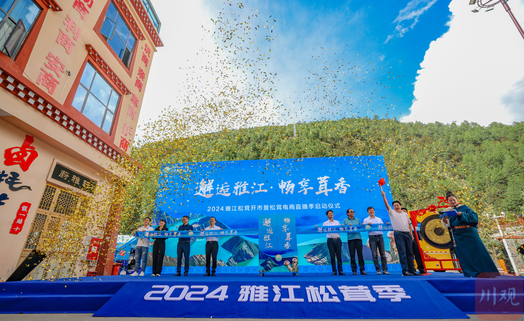 伴随着锣鼓声响,2024年雅江松茸正式开市。雅江县人民政府副县长杨雪梅为第一件网购“雅江松茸”贴上了溯源码,并从雅江正式发往远方。