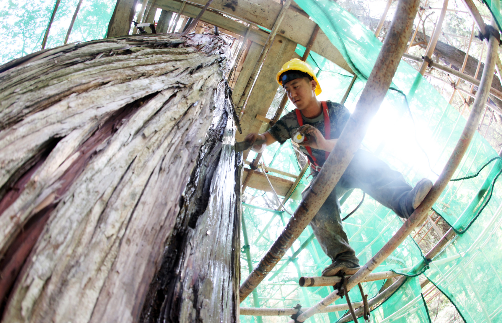 剑阁县翠云廊大柏树湾,工人抓紧对古柏进行防腐等复壮处理。唐彪 摄