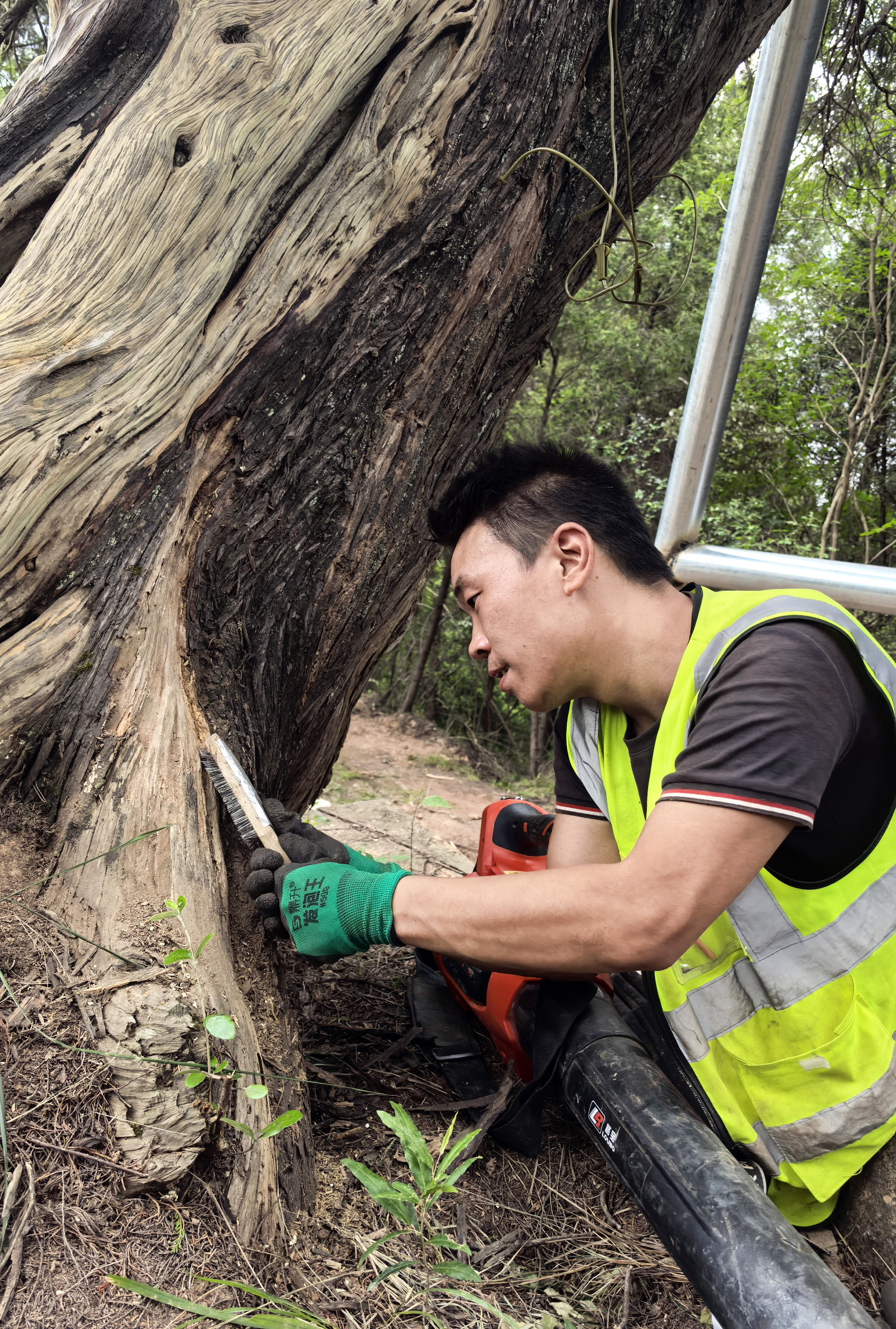 一旁的工人正拿着特制铁刷,小心翼翼地刷掉古柏根部腐坏的部分。“经过清腐、修复后,我们会在最外层刷上防水桐油,就可以让古柏健康生长。”唐天勇介绍,目前剑阁县已完成翠云廊大柏树湾等区域的古柏复壮修复,正在推进蜀道沿线其他区域古柏的复壮修复工作。