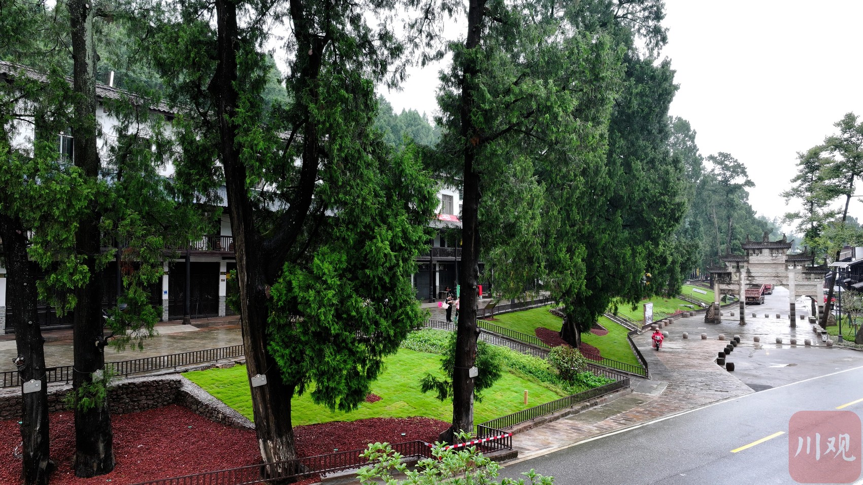7月18日下午,暴雨过后,剑门关古镇入口处,一株株参天古柏苍翠欲滴。
