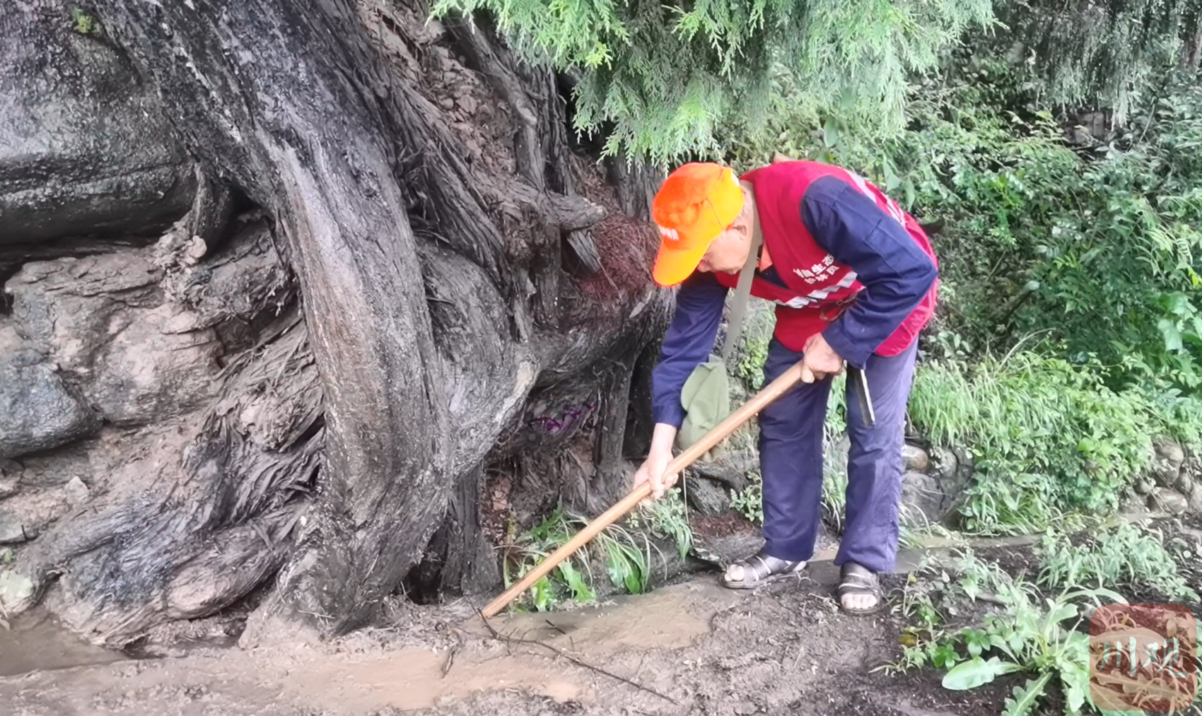 7月17日下午,趁着雨歇时间,剑门关镇剑门村护林员母培林沿路巡查古柏,清理因泥沙、树枝阻塞的排水沟。高志农 摄