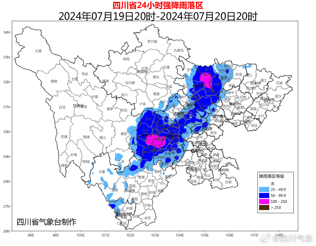 7月19日20时到20日20时:绵阳、德阳、雅安、眉山、乐山5市和广元西部、成都东部和西南部、资阳西部、遂宁西部有暴雨(雨量50~90毫米),局地有大暴雨(雨量140~200毫米),最大小时雨量40~70毫米。另外,甘孜州东南部、攀西地区西部和北部有大雨到暴雨(雨量25~60毫米)。