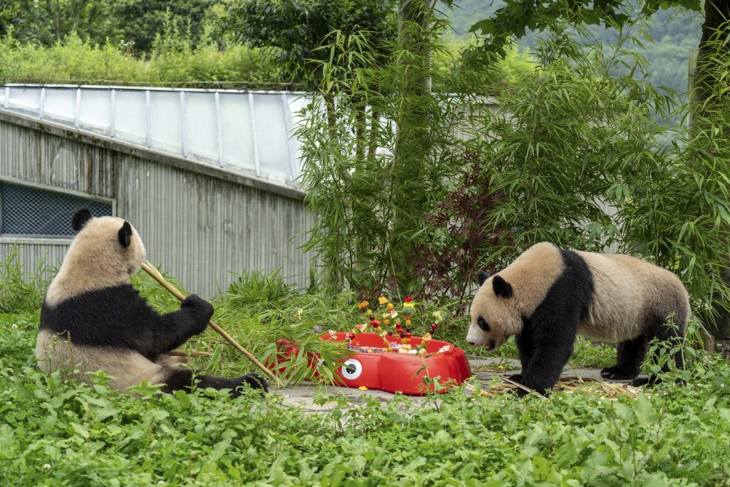 7月19日,在中国大熊猫保护研究中心卧龙神树坪基地,大熊猫“白吉”(左)和“胜兰”(右)在品尝美食。