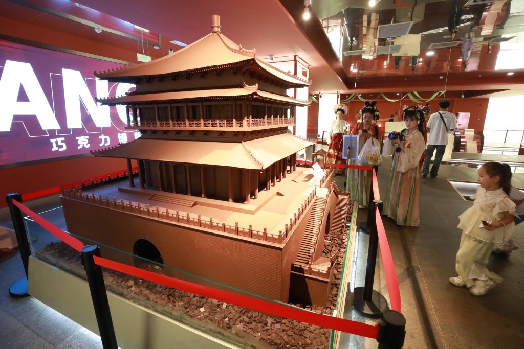 7月18日,游客在参观用巧克力制作的“西安钟楼”。