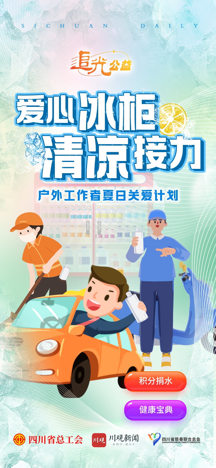 为聚集爱心,方便大家参与。即日起,川观新闻推出 “爱心冰柜 清凉接力”川观为您爱心直送活动,200积分即可兑换1瓶爱心水,由川观新闻代您捐赠给爱心冰柜,为炎炎夏日需要清凉补给的人们提供免费饮品。参与积分捐水,一次性捐赠1000积分还能获得署有您用户ID的专属公益证书。