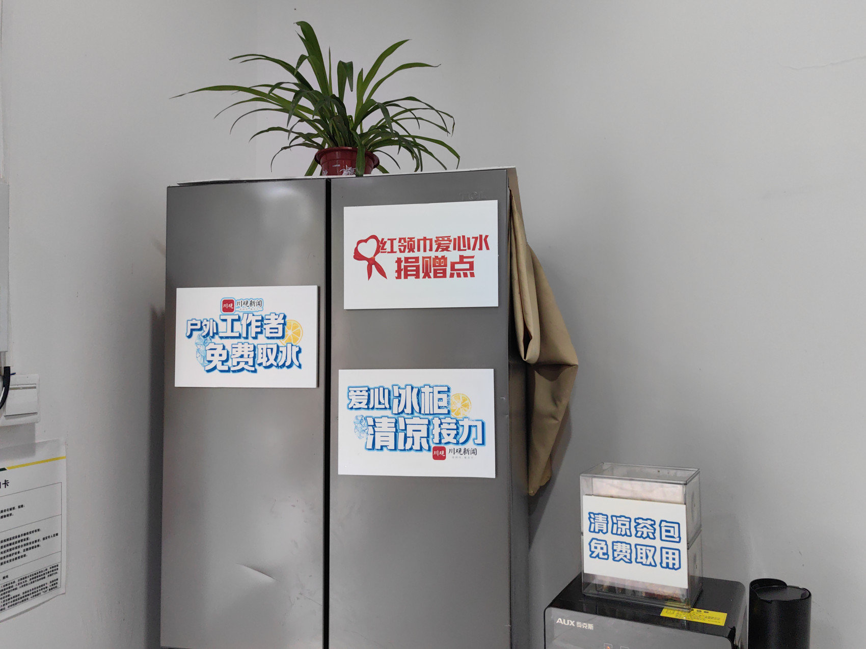 由川观新闻联合四川省总工会、四川省慈善联合总会共同发起的“爱心冰柜”公益活动第二季正在火热进行中。中国邮政集团有限公司成都市分公司、成都市天涯石小学加入到这场爱心接力中,在邮政天涯石北街职工驿站共同设立“爱心冰柜”红领巾爱心站点,为户外劳动者提供瓶装饮用水和清凉茶包。